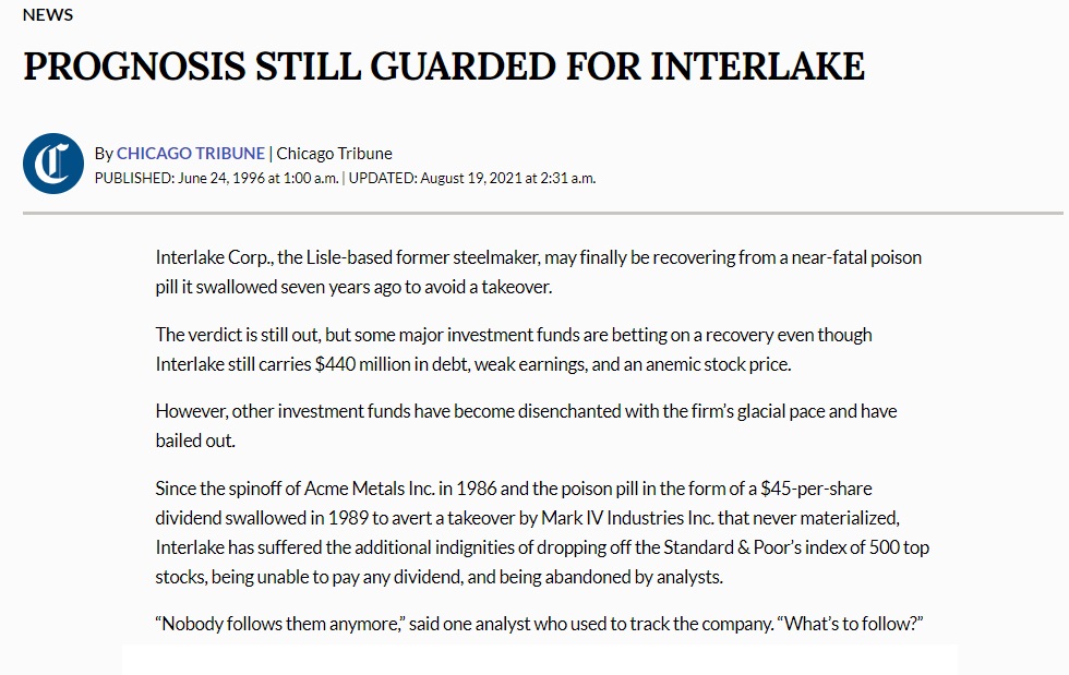 By then, Interlake was fighting for survival, burdened by debt, forgotten by analysts, and eventually trading for pennies. The Chicago Tribune described its decline in cautious terms—“prognosis still guarded”—but the reality was that the company had slipped from the ranks of the S&P 500 to the over-the-counter market, where a share could be bought for less than the price of a postage stamp.