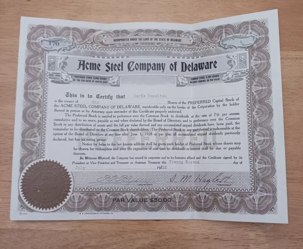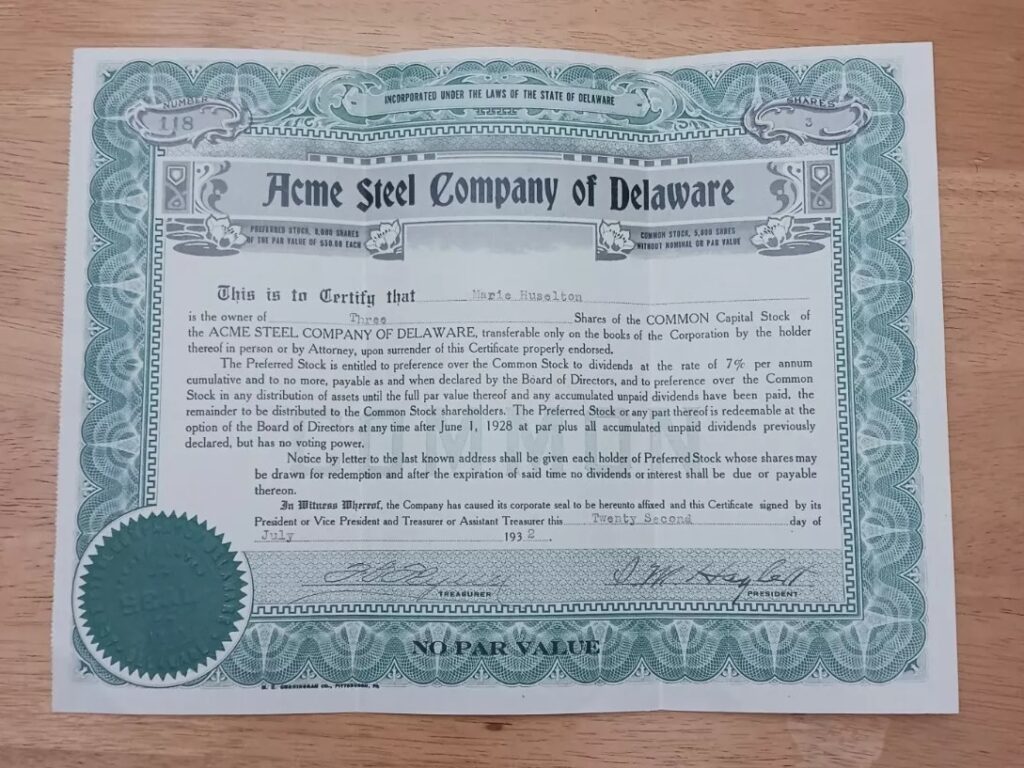 These stock certificates once stood for something much larger than paper. They were proof of ownership in Acme Steel and its parent, Interlake Iron—companies whose mills, batteries, and byproduct plants shaped thousands of lives along the Calumet River.